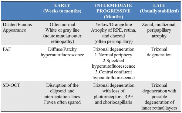A classification of AZOOR based on clinical fundus and multimodal imaging was proposed[13]: