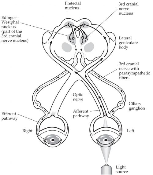 The afferent visual pathway consists of the retina, retinal ganglion cells, retinal nerve fiber layer, the optic nerve, the optic chiasm, optic tract, lateral geniculate nucleus, optic radiations, and visual cortex (Figure 1.). Within the retina, there is an external neuron which is the photoreceptor, which synapses to bipolar cells in the nuclear layer. The internal neuron nearest the vitreous humor is the retinal ganglion cell (RGC). The cell bodies of these neurons make up the ganglion cell layer and the axons form the retinal nerve fiber layer (RNFL) and optic nerve (ON), ultimately synapsing with neurons in the lateral geniculate nucleus (LGN) of the thalamus [8][9].