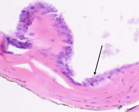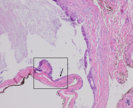 Microscopically, apocrine hidrocystomas can appear as a unilocular or multilocular cystic lesion composed of two layers. The first layer is the inner cyst wall that is composed of secretory columnar epithelium. The secretory columnar epithelium can consist of a single layer or a double layer of cuboidal-columnar epithelium. [6] The inner layer of the cysts lies in front of the myoepithelial cells which comprise the outer or peripheral layer. [7] When lipofuscin granules are present, PAS-positive granules can also be seen histologically.[1] Apocrine hidrocystomas also exhibit papillary projections which appear in the lumen of the cyst as an outgrowth from the wall. Papillary projections consist of vascular connective tissue covered by secretory epithelium. [7]