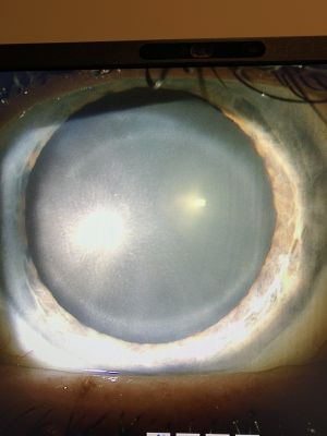 On slit lamp examination, intrastromal (of varying depths) mid-peripheral symmetric bilateral corneal rings are observed. The photos in Melles's 1998 article portray a large narrow stromal ring opacity in the midperipheral cornea that appears similar to the outline of a LASIK flap.[2] The photos in Megalla's 2021 case report show a slightly thicker, hazy 7mm stromal ring. Khan and Shuttleworth [4]offer a detailed description of their patient: