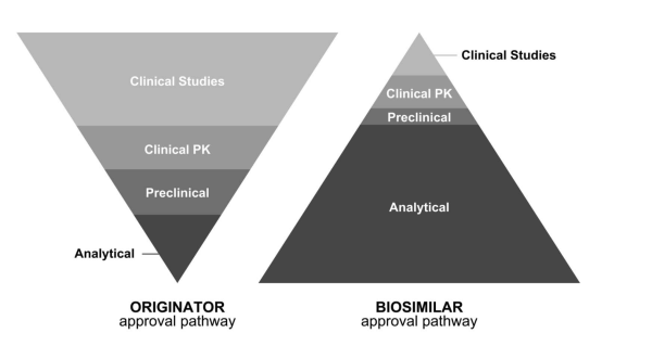 The United States (US) established safety and bioequivalence standards for biosimilars in 2009. For approval, the US Food and Drug Administration (FDA) requires evidence that there are “no clinically meaningful differences in safety, purity, and potency between the biosimilar and reference product”.[20] This is achieved via a stepwise approach, which differs from the drug approval pathway for the reference biologic, as biosimilar approval relies more heavily on analytical data performed to establish similarity in physicochemical properties (Figure 3).[8][17] The efficacy of a biosimilar product is assessed based on pre-determined equivalence margins using selected clinical endpoints.[8] Following assessment by regulatory authorities such as the FDA, if no clinically meaningful differences are found, the biosimilar is automatically approved for all indications of the reference drug, even if the biosimilar was not directly studied in clinical trials. This principle, referred to as “indication extrapolation,” reduces the cost of manufacturing biosimilars.[20]