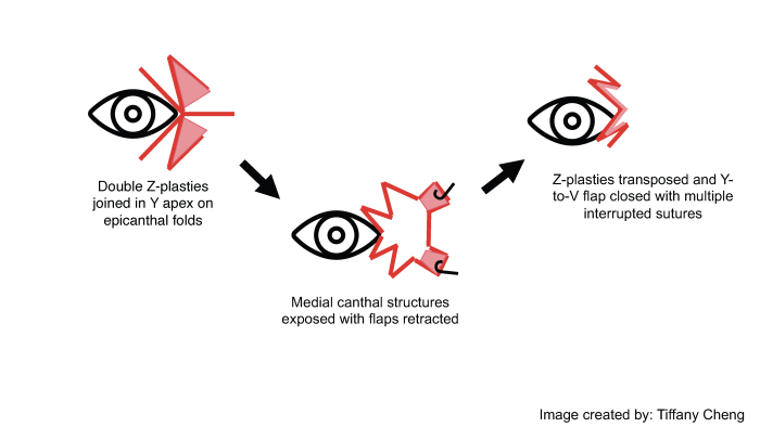 Surgical approach for the medial canthoplasty has varied. Options include the Y to V flap, the Five-Flap technique (combination of Y-to-Z flap with double opposing Z-plasties on the apex), the Hornblast C-to-U flap (see video), and Mustarde’s technique. Shown below are Y to V flap, the Five-Flap technique, Hornblast C-to-U flap, and Mustarde’s technique: