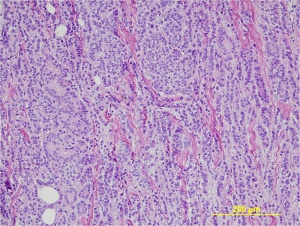 The histology features of adenocarcinoma of the breast vary, and the histologic features of orbital metastases may differ from that of the primary tumor.[2] All metastatic breast carcinoma is considered invasive. Types of invasive breast carcinoma include ductal, lobular, and mixed.[6]