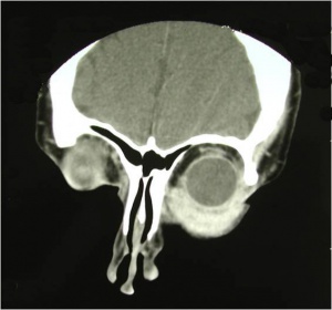 - Orbital cellulitis – clinical findings include fever, leukocytosis (75% of cases), proptosis, and restricted ocular motility with pain on attempted eye movement.[10] A preceding history of URI, sinus symptoms, or trauma could be consistent with orbital cellulitis, and imaging would commonly demonstrate sinus disease and possible subperiosteal abscess.
