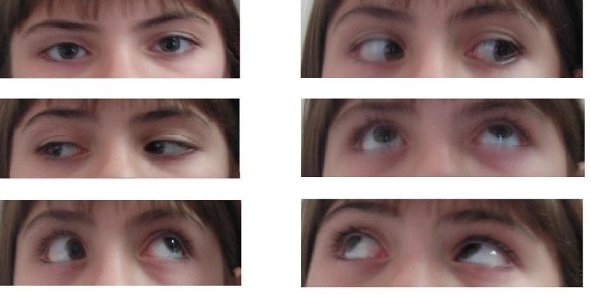 The key finding in Brown syndrome is limited or no elevation in adduction. Limited elevation in straight-up gaze and abduction can also be present, but are more subtle. Other features that may be present include V pattern deviation in up gaze, eyelid widening in adduction, the presence of hypotropia in the primary position, and down shoot in adduction.[7] In mild cases, there is no vertical deviation in primary position or downshoot in adduction. In moderate cases, there is no vertical deviation in primary position, but there may be a downshoot in adduction. In severe cases, there may be both a hypotropia in primary position and downshoot in adduction.[8] A compensatory abnormal head position may also be present in some cases; patients may adopt a chin up position or a head turn away from the affected eye (to keep the affected eye abducted, avoid hypotropia, and promote binocular fusion).