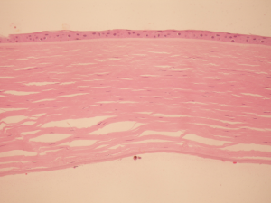 Mild stromal edema, with a loss of corneal endothelial cells, has been reported after prolonged CMV endotheliitis in histologic analysis of both native cornea tissue[2] and failed penetrating keratoplasty grafts[16]. Notably, histopathology demonstrated a lack of prominent inflammation as well as an absence of reactive leukocytes in the corneal stroma. (Figure 2)