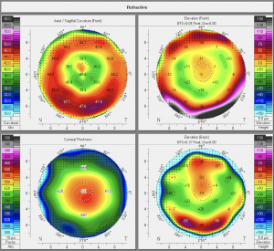 Challenges for IOL Calculation: RK changes the curvature of the central cornea and it’s overall topography where the cornea is flat centrally and steeper in the periphery. Standard topography can overestimate central corneal power which results in a post-operative hyperopic surprise. Central corneal power is not the real corneal power required for IOL calculations. Instead we need to find the effective corneal power.