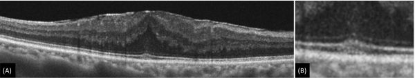 - Acute idiopathic maculopathy - Patient presents with acute unilateral visual loss. OCT shows subfoveal hyperreflective thickening at the level of the outer retina and RPE and hyporeflective fluid in subretinal space. It is generally a self-limiting condition.