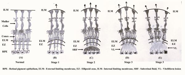 - Stage 3 CB alteration (acquired vitelliform lesion): Persistent separation of the cone and the underlying RPE leads to disruption of physiology related to the RPE photoreceptor complex. As a result, metabolic cone debris start accumulating in the subretinal space and thereby leading to development of acquired vitelliform lesion (figure 2D). This may be associated with ELM disruption and intraretinal migration of hyperreflective material (figure 2E). This may lead to subsequent collapse of vitelliform lesion.