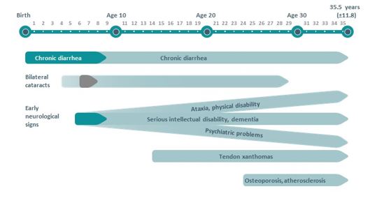 Typical clinical characteristics of CTX may include some combination of infantile-onset chronic diarrhea, bilateral cataracts with juvenile onset, tendon xanthomas, psychiatric and abnormal behavioral symptoms, and cognitive and other neurologic impairments. Clinical features are variable in severity and onset.[1] [13](Fig. 2)