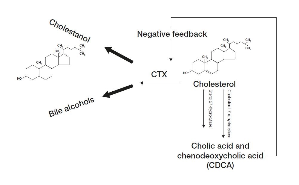 As chenodeoxycholic acid (a potent inhibitor of cholesterol 7-alpha-hydroxylase) is decreased, cholesterol cannot be properly excreted in the form of bile acids. These conditions lead to a significant increase in the levels of bile alcohols and levels of cholestanol, a byproduct of abnormal bile acid synthesis.[2] (Fig. 1)