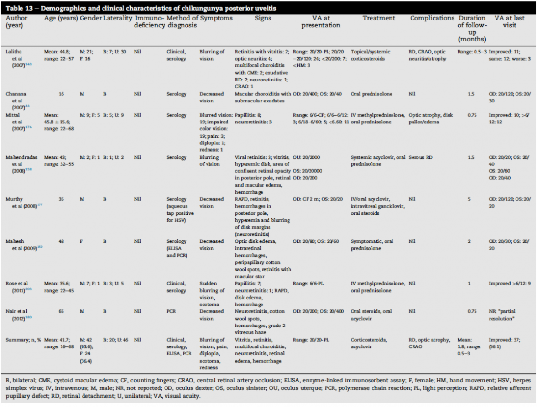 - ↑ 2.0 2.1 2.2 2.3 2.4 2.5 2.6 2.7 P. Mahendradas, K. Avadhani, R. Shetty, Chikungunya and the eye: a review. J Ophthalmic Inflamm Infect 3, 35 (2013).