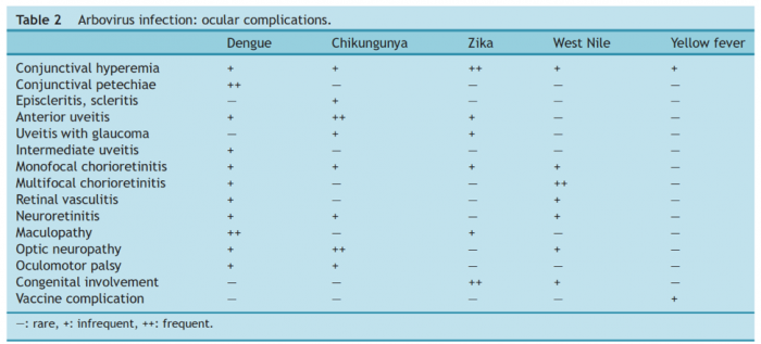 - ↑ 12.0 12.1 12.2 12.3 12.4 12.5 H. Merle et al., Ocular manifestations of emerging arboviruses: Dengue fever, Chikungunya, Zika virus, West Nile virus, and yellow fever. J Fr Ophtalmol 41, e235-e243 (2018).