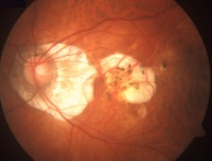 This image is a fundus photograph of a patient with myopic degeneration. Note involvement of the center of the macula, which is affected sooner in myopic degeneration than in choroideremia.[69] |