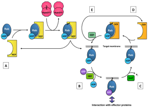 The CHM gene encodes for Rab escort protein-1 (REP-1). REP-1 is one of two Rab escort proteins, both of which are found throughout the body.[18] REP-1 is involved in a complex system of intracellular trafficking of various lipid membrane-bound structures. These vesicular structures are guided by GTP-binding proteins (Rab proteins).[10] For Rab proteins to be connected to the lipid membrane and allow intracellular trafficking, they need to be prenylated, which is the addition of geranylgeranyl groups to a molecule.[10][18][19] REP-1 proteins aid in this process by bringing Rab proteins to the Rab geranylgeranyltransferase (GGTase) complex, where the prenylation occurs.[18] REP-1 also facilitates the transfer of the prenylated Rab protein to its target location.[18] Without this escort, the prenylated Rab would undergo inactivation.[18] The figure to the left demonstrates the role of REP in the Rab cycle. [20]