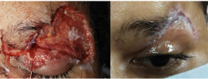 The word plastic surgery takes its origin from the Greek word plastin, which means to be able to mold. Plastic surgery is a branch of general surgery which is reconstructive and aims to repair the defects or malformations with the restoration of function and improvement in appearance. Skin grafting is a commonly performed procedure in reconstructive oculoplastic surgery. In simple terms, skin graft means reconstructing a skin defect by placing the skin from anywhere in the body. The history of skin graft dates back to 2500-3000 years back when the grafts were initially used to cover the defects caused by the nose amputation. The ancient Indian method included the subcutaneous fat also, along with the skin graft, taken from the gluteal region. The significant development in skin grafting procedures took place in the 19th century. Reverdin introduced the concept of pinch graft, which hastened the healing of granulated wounds by small bits of transplanted skin. Thiersch introduced a split-thickness graft, wherein an epidermis sheet was used to cover the defect. Wolfe later used a full-thickness graft to cover a lower lid defect. [14]