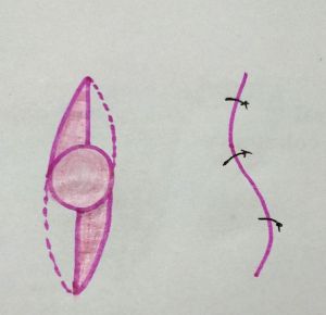 b. The paper is placed over the donor site and the size is marked using a marker pen. The donor site is anaesthetized by injecting 2% lidocaine with adrenaline in the subcutaneous plane. An incision is made over the skin using a no. 15 scalpel blade,1-2mm away from the markings (slightly over-sized graft to take care of primary contraction except eyelid skin graft which is kept the same size as recipient defect) and the graft is removed using blunt forceps and Wescott scissors. The depth of the dissection should be subcutaneous avoiding taking fat in it. The graft is kept moist in a bowl of saline.