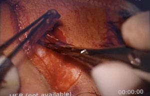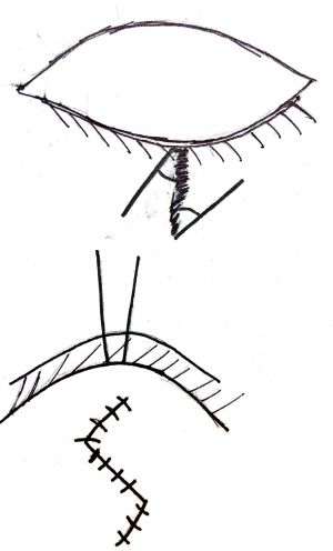 f. To promote graft contact with the recipient bed quilting sutures can be used. Few stab incisions should be put in the graft to allow drainage of fluids and to prevent hematoma formation. A rolled piece of sterile gauze with ointment is placed over the graft to stabilize the graft and prevent fluid/ blood accumulation beneath the graft. Suture tarsorrhaphy helps in stabilizing the eyelid.
