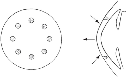 Treatment with CK is based on the effect of temperature on the biomechanical properties of the cornea.[1] At 55-65°C, collagen dehydrates and retracts, but retains its original configuration on cooling. At temperatures above 70-100°C, however, collagen completely denatures resulting in necrosis and permanent damage.[2] CK delivers controlled-released radiofrequency current (350-400 kHz) within peripheral corneal stroma to a depth of 500 µm through a thin, hand held probe (keratoplast tip; Refractec Inc., Irvine, California). The electrical impedance to energy flow through collagen fibrils increases the tissue temperature to the 65°C target resulting in controlled shrinkage of the peripheral collagen lamellae.[2][3][4][5] Circles of eight spots are created by repeated insertion of the probe at 6, 7, or 8 mm circumference optical zones as determined by nomogram for a total of 8, 16, 24, or 32 spots. Shrinking the peripheral collagen has a tightening effect on the mid-peripheral cornea which causes increased curvature of the central cornea, increasing refractive power. (See Figure 1)