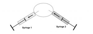 There are reports on the application of trichloroacetic acid (TCA) 20%-25% for superficial conjunctival cysts with high success rates, and reports of TCA 10%-20% injection into conjunctival cysts in ophthalmic and anophthalmic sockets,[26] as well as in children and multiple cysts, with 100% success (Figure 8).[27] Kothari reported 2 cases of conjunctival inclusion cysts following strabismus surgery treated using a paired injection technique. The technique consists of using two 31-gauge insulin syringes, one empty syringe (syringe 1) and the other filled with 0.5 mL 70% isopropyl alcohol (syringe 2), simultaneously. The fluid from the cyst is aspirated into syringe 1 as the cyst is simultaneously filled with the alcohol from syringe 2 to prevent collapse. Once all of the alcohol from syringe 2 is injected, aspiration (syringe 1) is stopped. The cyst remains inflated and filled with alcohol throughout the procedure. Thirty seconds later, the cyst is emptied by aspirating the alcohol with syringe 1 (Figure 9). There was no recurrence in a 9-month follow-up.[28]