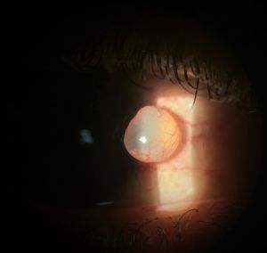 The diagnosis of a conjunctival inclusion cyst is essentially clinical (Figure 3A). Histopathology can confirm the diagnosis, but this is not usually necessary. Slit-lamp examination should include a measurement of the size of the cyst, assessment of the characteristics of its wall(s) and internal content, and whether it transilluminates (Figure 3B). The walls are usually thin and translucent.