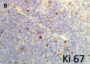 Analysis of fresh, unfixed tissue with flow cytometry for specific immunohistochemical antibodies stains positive for polyclonal markers (e.g., both CD3 T lymphocytes and CD20 B lymphocytes) (Fig. 5A).[7] Immunohistochemistry also reveals low levels of KI-67, a marker of active cell proliferation (Fig. 5B).[7]