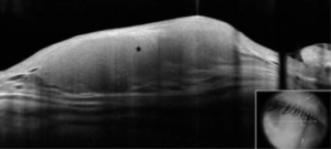 Ultrasound biomicroscopy may be performed to confirm lesion depth and diameter (Fig. 2).[7] On optical coherence tomography (OCT), the tumor presents as a homogeneous, hyporeflective lesion with thin overlying epithelium (Fig. 3).[2]