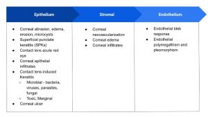 While contact lenses provide a multitude of benefits, complications from contact use are common.[58] Complications of contact lens use can be split into three categories–conjunctival, corneal, and other complications.[59] Conjunctival complications include allergic conjunctivitis, giant papillary conjunctivitis, and superior limbic keratoconjunctivitis. Corneal complications can be divided into epithelial, stromal, and endothelial as listed in the adjacent table.