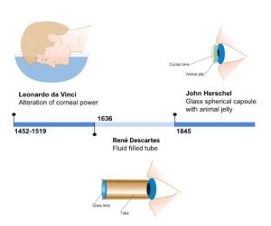 The initial concept of contact lenses is thought to have originated in the 16th century, with Leonardo da Vinci’s Codex of the Eye, Manual D. Da Vinci noted that placing one’s head in a container of water could change corneal power.[5] In the 17th century, René Descartes proposed that refraction could be altered using a fluid-filled tube with a glass lens at the end. A more practical lens design was suggested by Sir John Herschel in the mid-1800s. He correctly suggested that astigmatism could result from severe corneal abnormalities and theorized that it could be corrected by placing an animal jelly-filled, spherical capsule on the cornea.[6][7][8] While frequently attributed to Herschel, other inventors, unaware of Herschel’s ideas, discovered that a contact lens could be crafted by taking a mold of the cornea and transposing it to a transparent medium.