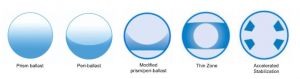 Common toric designs for lens stabilization include prism ballast, peri-ballast, modified prism/peri-ballast, dual thin zone, and accelerated stabilization.[20][21] Each has different areas of thickness to stabilize the lens. In the diagram, blue shaded areas correspond to thicker parts of the lens.
