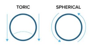 Corrective contact lenses may be purposed to help correct all orders of refractive aberration. Spherical contact lenses are used to correct second order aberrations including myopia and hyperopia. Spherical lenses, in principle, are cut from spheres such to focus light to a point with the same power in all directions.[15] Visual acuity in spherical contact lenses will not change no matter the orientation in the eye.