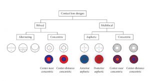 Simultaneous image contact lenses come in either concentric (bifocal or multifocal) or aspheric (multifocal) designs. Concentric designs feature a center of either near or far spherical correction surrounded by alternating rings of near and distance correction, whereas aspheric designs provide a progressive and gradual change of corrective power. These allow for the simultaneous presentation of both near and far images to the retina, relying on the user’s neural adaptation to choose the proper focus for the object in view.