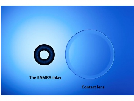 The Kamra Inlay (AcuFocus, Inc., Irvine, California, USA), previously known as ACI 7000, is an opaque ring shaped inlay made of polyvinylidene fluoride and carbon. It is 5 microns thick with an outer 3.8 mm diameter and a central 1.6 mm aperture. The ring has 8400 laser etched holes to facilitate diffusion of aqueous, oxygen and nutrients through the cornea. It is commercially available in the United States, Europe, Asia-Pacific, South America, and the Middle-East.
