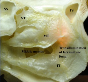 Technique (Endonasal/Endoscopic DCR): The primary benefit of the endonasal, or internal, approach is the lack of skin scarring. The nasal mucosa and middle turbinate are first decongested for vasoconstriction and hemostasis. Using a nasal endoscope for visualization, the lateral nasal mucosa adjacent to the lacrimal sac is then incised vertically and elevated. The sac location is typically located anterior to the anterior aspect of the middle turbinate along the nasal wall. A fiberoptic endoilluminator, as used in vitreoretinal surgery, may be inserted through the canaliculi into the sac in order to help transilluminate the lacrimal bone medial to the lacrimal sac if needed.