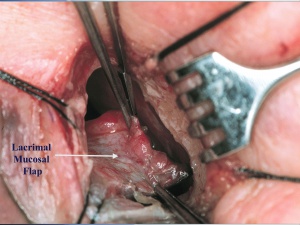 A 0-0 Bowman probe is passed into the lacrimal sac to tent the sac medially, and Westcott scissors are used to open the lacrimal sac from the duct to the fundus, with relaxing incisions at both ends. Any abnormal scar overlying the opening of the common canaliculus, lacrimal sac stones, foreign bodies, or masses are removed if present. A corresponding incision is made in the nasal mucosa, to create anterior only, or anterior and posterior flaps.