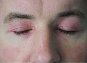 Symptoms of DM include difficulty climbing stairs, rising from a seated position, lifting objects, combing hair, raising head from pillow, and in severe cases dysphagia or dysphonia. Cutaneous symptoms include several types of skin rashes, photosensitivity, changes in pigmentation, and pruritus.[4] Ophthalmic symptoms includes heliotrope eyelid eruptions, periorbital redness, periorbital edema, ptosis, chemosis, exophthalmos, ophthalmoplegia, diplopia and strabismus.