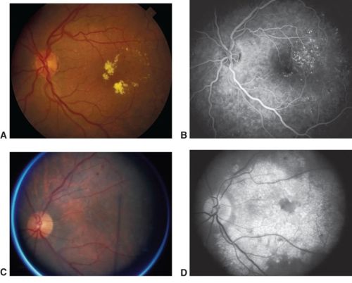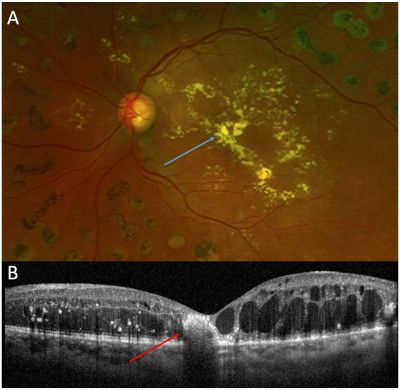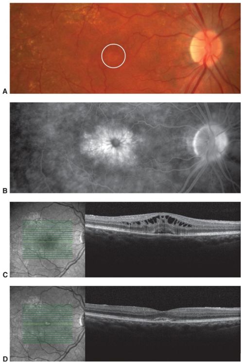 Other causes of DME include retinal vein occlusion, ruptured macroaneurysm, Irvine-Gass syndrome, radiation retinopathy, hypertensive retinopathy, subfoveal choroidal neovascularization, retinal vein occlusion, and VMIA. OCT and FA ancillary diagnostics can help to identify these differential diagnoses (Figures 10–11).