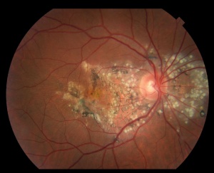 Fluoroscein angiography (FA) can reveal presence of CNVM with leakage, and large drusen are typically hyper-fluorescent in late stages[11]. Variable hypo or hyperfluorescence can be seen in areas of pigmentary changes, atrophy, and scarring. Indocyanine green angiography (ICG) can also be used to differentiate between two types of drusen. This imaging modality has shown different patterns of staining between large central drusen and small radial drusen. Large central drusen initially present as hypofluorescent, and then become hyperfluorescent spots surrounded by halos of hypofluorescence in the late phases. Small radial drusen on the other hand, present with hyperfluorescence in early phases and decreased fluorescence in late phases. [14]