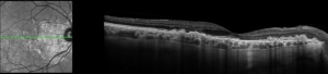 Spectral domain optical coherence tomography (SD-OCT) imaging can reveal focal dome-shaped, saw-tooth, or diffuse hyperreflective deposits with elevation between the RPE and Bruch's membrane, usually becoming more confluent over time[11]. Early in disease, the outer retina (photoreceptors) may remain intact, but later stages can show variable or diffuse ellipsoid zone loss, as well as outer and inner segment disruption. OCT can also reveal hypo-reflective fluid from a corresponding neovascular membrane. Diffuse retinal atrophy can be seen in later stages, however outer retinal changes are not often seen outside of areas with sub-RPE changes[12].