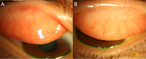 Dupilumab (Dupixent® by Regeneron & Sanofi, USA), is the first FDA-approved biologic systemic treatment for atopic dermatitis. This human monoclonal antibody binds to interleukin-4 receptor subunit alpha (IL-4Ra) and effectively blocks IL-4 and IL-13 signaling, which induces the inflammatory process responsible for asthma, atopic dermatitis, and chronic sinusitis with nasal polyps.[1][2] In Phase 3 of clinical trials, the incidence of conjunctivitis (including viral, bacterial, allergic conjunctivitis, and atopic keratoconjunctivitis) was higher in patients treated with dupilumab and topical corticosteroids compared to the control group treated with placebo and topical corticosteroids (8% vs 14-19%). Most cases of conjunctivitis in clinical trials were reportedly mild, and only one patient discontinued dupilumab due to severe unilateral atopic keratoconjunctivitis.[1] However, since its FDA approval in March 2017, there has been an increasing number of reports of severe dupilumab-induced conjunctivitis, which warrants a closer look at this disease entity.