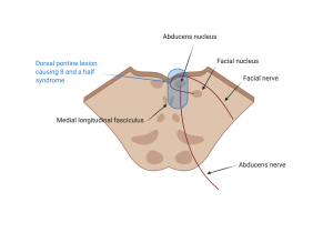 One-and-one-half syndrome describes a lesion that involves the abducens nucleus, PPRF, and MLF ipsilaterally. This results in a conjugate horizontal gaze palsy in one direction and an INO in the other direction. Lesions to the facial nerve fascicle result in an ipsilateral lower motor neuron facial palsy (which involves the forehead, compared to upper motor neurone facial nerve palsies which are forehead sparing). Combining a One-and-a-half syndrome with a lesion to the ipsilateral facial nerve fascicle nearby is dubbed “Eight-and-a-half syndrome” (CN 7 + 1.5). Eight-and-a-half syndrome localizes to the dorsal tegmentum of the caudal pons.[1] The etiology is most commonly a vascular or demyelinating lesion.[1]
