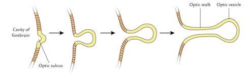 Soon after gastrulation, the embryo then undergoes neurulation (Figure 1). During neurulation, a flat sheet of cells called the neural plate folds in on itself to form the neural tube. Around day 22 of gestation, the optic grooves emerge on the neural folds (Figure 1 - orange dots), evolving into optic vesicles by day 25. These vesicles contact the surface ectoderm, inducing the formation of the lens placode (Figures 2 and 3). The proximal portion of the vesicle (the optic stalk) will ultimately become the optic nerve, where the distal portion invaginates to form the optic cup (and is destined to become the future retina, iris, and ciliary body).
