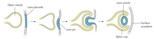 Lens formation begins when the optic vesicle induces inward invagination and budding of the overlying surface ectoderm to form the lens vesicle (Figure 3).[6] The posterior cells of the lens vesicle elongate anteriorly to form primary lens fibers, filling the lumen by the seventh week. Secondary lens fibers continue to develop throughout life, contributing to lens growth. Lens development obtains nutrition via derivatives of the hyaloid artery. Later, after hyaloid artery regression, lens nourishment is supplied via the aqueous humor.