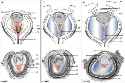 The vitreous is primarily composed of a gel-like substance called vitreous humor, and is a mesenchymal derivative. The developmental progression of the vitreous can be thought of as a succession of three distinct phases. The first phase, termed the primary vitreous function to house the hyaloid vasculature as it provides nourishment to the developing anterior segment (Figure 6). As the primary vitreous and hyaloid vasculature regress, they are succeeded by the acellular, avascular secondary vitreous, which ultimately forms the bulk of what is thought of as the mature vitreous. Regression of the primary vitreous leaves behind Cloquet's canal, a vestigial structure that run through the vitreous body from the optic nerve disc to the lens in the mature eye and is sometimes visible in the mature eye.[10] The final step of vitreous development comes when tertiary vitreous form the lens zonules.[11]