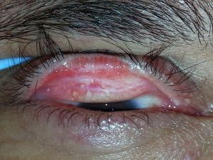 Cicatricial entropion results from chronic inflammation leading to fibrosis, scarring and shortening of the posterior lamella. These cases are associated with other stigmata of chronic inflammation such as symblepharon, forniceal shortening, keratinization, and loss of normal margin structures. This is unique from other causes of entropion because it is usually secondary to a systemic and progressive inflammatory condition such as ocular cicatricial pemphigoid, Stevens-Johnson syndrome, trachoma, and herpetic disease.[1][23] An early form of cicatricial entropion is Meibomian Gland Inversion(MGI) commonly encountered in chronic meibomitis or aggressive electroepilation with scarring of the posteior lamella.