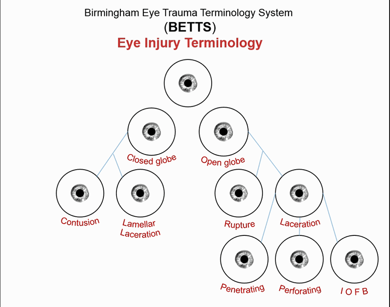 A universal system of unambiguous communication is key to clear and effective reporting both in clinical practice and research as categorising trauma is essential for prognostication, management and to develop prevention strategies. Globe injuries have been categorized using the Birmingham Eye Trauma Terminology (BETT) system as open or closed globe based on whether they are with or without a full thickness wound to the eye wall, respectively.[13] Further subclassifications of closed globe injuries include contusions (blunt trauma) and lamellar lacerations (sharp trauma), while open globe injuries are broadly categorized into ruptures (blunt trauma) or lacerations (sharp trauma). Lacerations are further categorized into penetrating, perforating, or intraocular foreign body injuries.