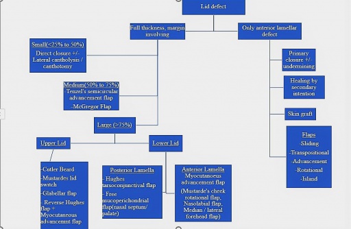 A reverse tenzel semicircular advancement flap, can be used for upper eyelid defects upto 2/3rd of defect. For larger defect lid sharing procedure (Cutler-Beard), sliding tarsoconjunctival advancement flap or a reverse Hughes flap is the norm.