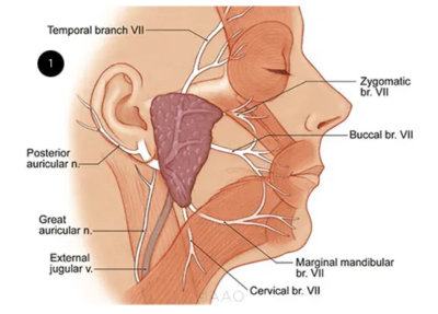 The facial nerve originates from the brain stem. It traverses the facial canal within the temporal bone, emerging through the stylomastoid foramen. Subsequently, within the parotid gland it undergoes division into five terminal branches: temporal, zygomatic, buccal, marginal mandibular, and cervical.