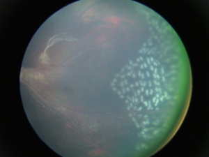 - Retinal detachments - Tractional and/or rhegmatogenous retinal detachments can be seen in severe cases, occurring in 21–64% of affected individuals.[48] In the Ranchod et al series, of the 91 patients who presented with a retinal detachment in the worse eye, 62 (68%) presented with some degree of retinal detachment in the fellow eye as well.[42]