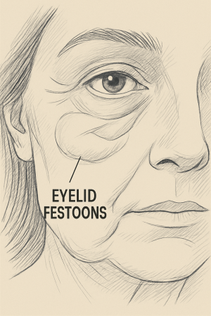 Patients with festoons may report a variety of symptoms, ranging from cosmetic concerns to functional impairments. Many individuals seek medical attention due to the aesthetic impact of festoons, describing feelings of being self-conscious or dissatisfied with their appearance. Some patients may experience a sensation of heaviness or pressure in the affected area, particularly in the lower eyelids, which can contribute to fatigue and discomfort. In severe cases, festoons can impair vision by obstructing the visual field or irritating the ocular surface. Similar to other orbital conditions involving anatomical distortion, patients may also report symptoms consistent with dry eye disease.[19].